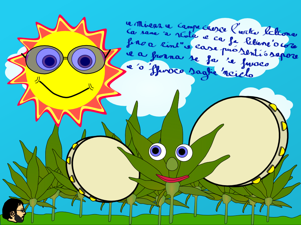From an arbitrary extrapulation of a verse, that is “freehand” written in top left corner, from a song by the “Nuova Compagnia di Canto Popolare”. The song is “Festa do Sole” from the album “Pesce do mare”. The verse means something like “the good grass grows in the fields, the grass that aid to live and that heals the heart. You can feel her scent even from your home. The leaf will burn and the fire will go up to sky”.